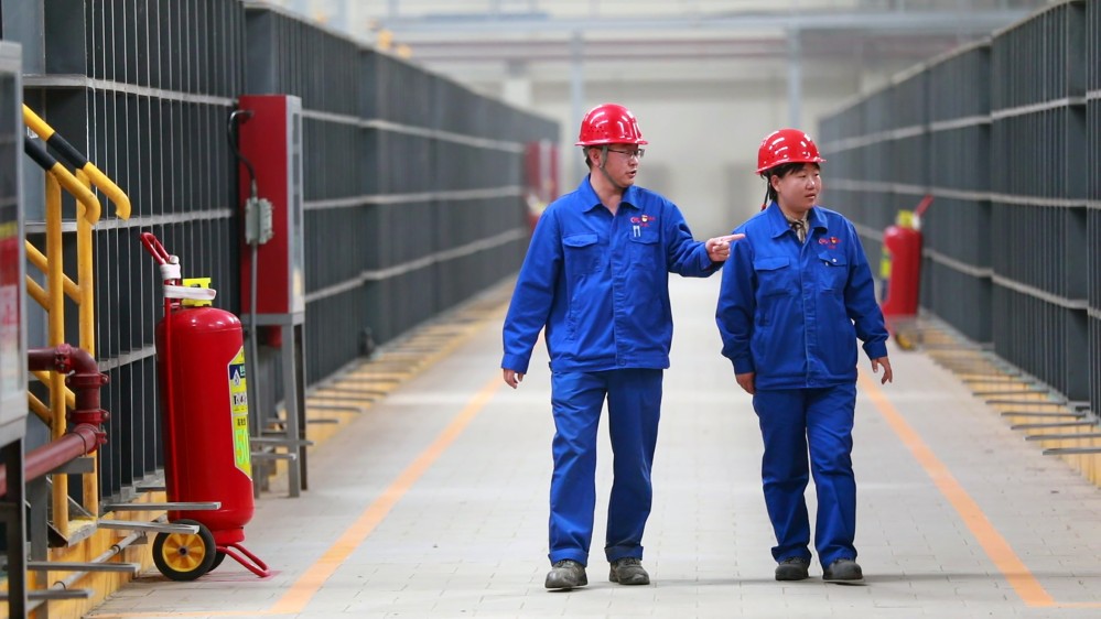 在甘肃稀土公司11000吨萃取生产线,两名工作人员在巡查这套集数字化、智能化和绿色化为一体的自动化生产线。(本报记者郭刚 摄)