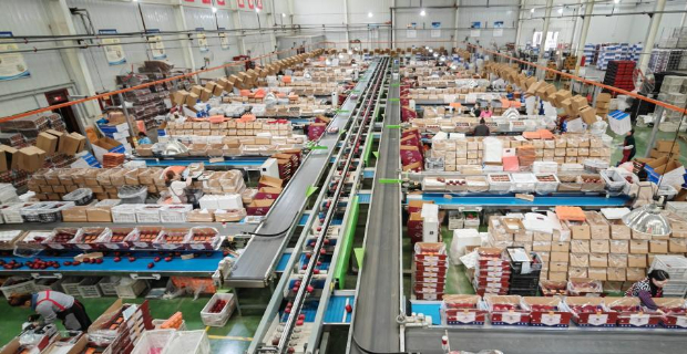 秦安雪原果品有限责任公司的苹果分选生产流水线。新华社记者 文静 摄