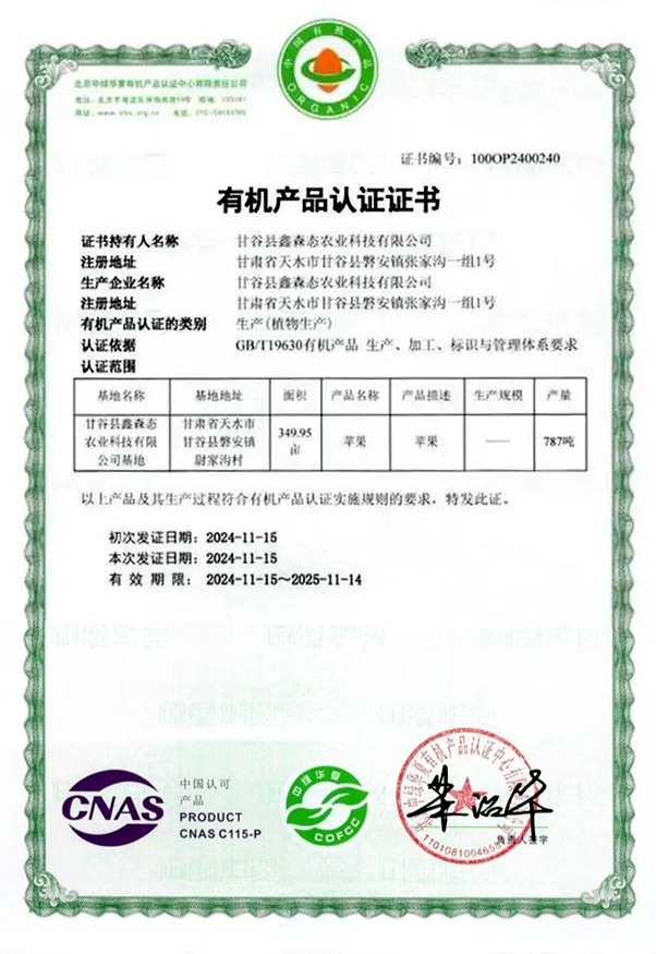 大西北网讯 近日,甘谷县鑫森态农业科技有限公司的苹果生产基地成功通过有机认证,成为甘谷县首个获得有机食品认证的企业,标志着该县苹果产业向标准化迈出了里程碑式的一步,为高质量发展奠定了坚实基础。