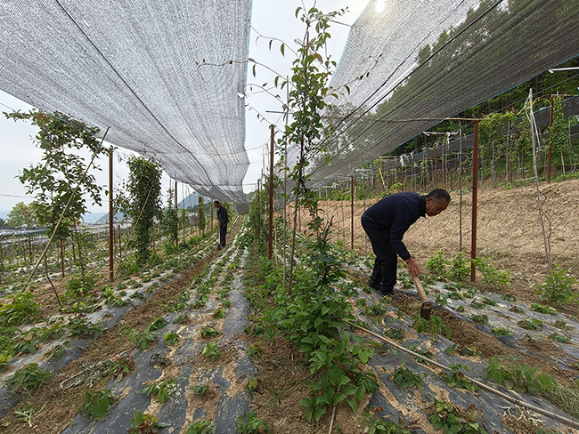 成县龙凤山林场毛川林区林下经济示范点工人正在除草管护淫羊藿。杨造顺