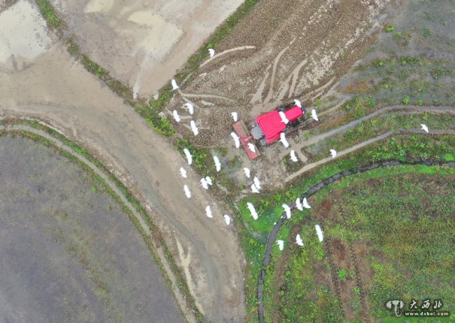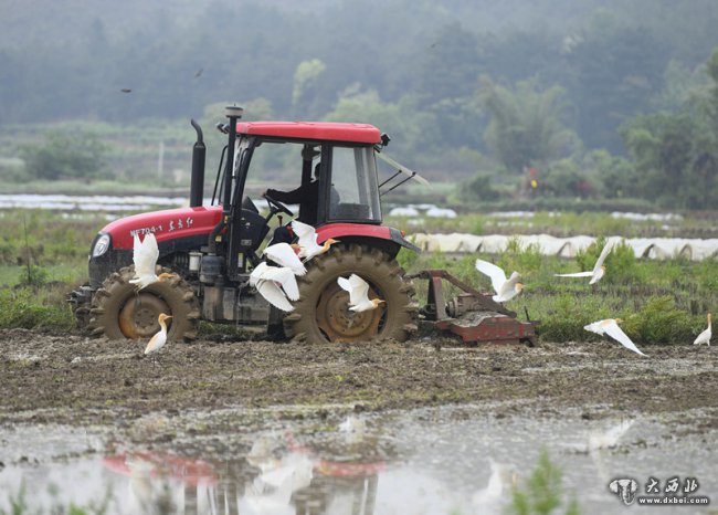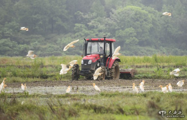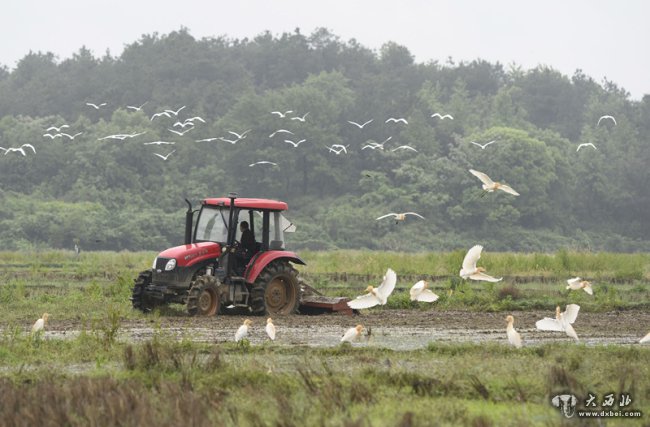 人民网长沙4月12日电 湖南省永州市道县富塘街道塘背村,农民驾驶拖拉机在翻耕早稻田,翩翩白鹭在翻耕后的农田里觅食,时而飞翔,时而驻足,与农机、稻田构成了一幅美丽和谐的生态画卷。
