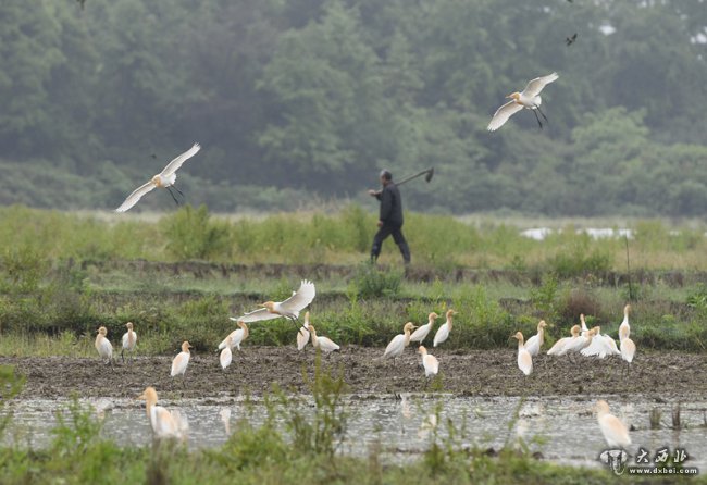 农民走在田间,翩翩白鹭在翻耕后的农田里觅食。蒋克青摄