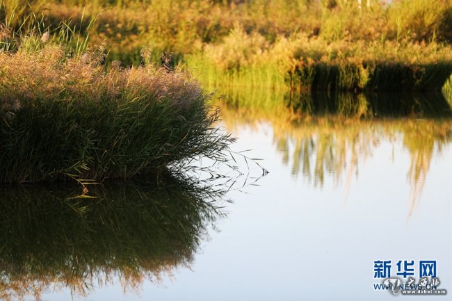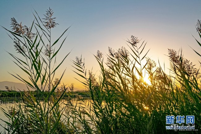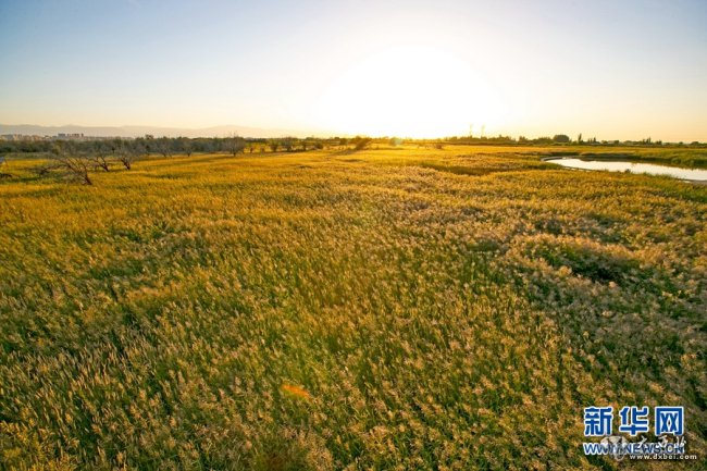 初秋傍晚,甘肃张掖国家湿地公园里,片片芦花随风摇曳,落日余晖为它们披上了金色的纱衣。新华网发(成林 摄)