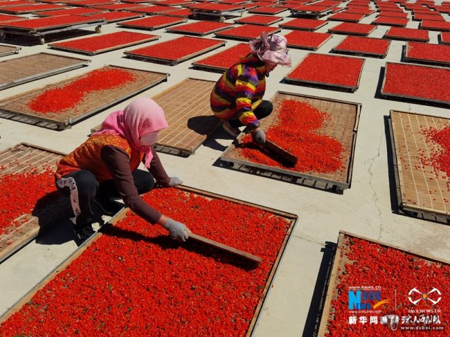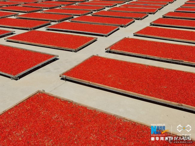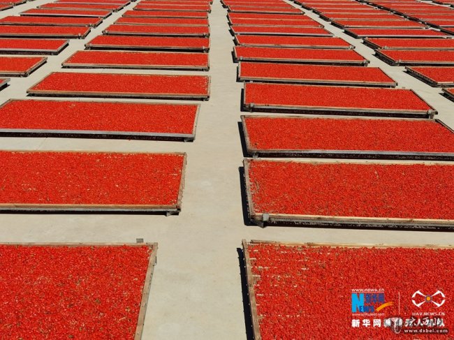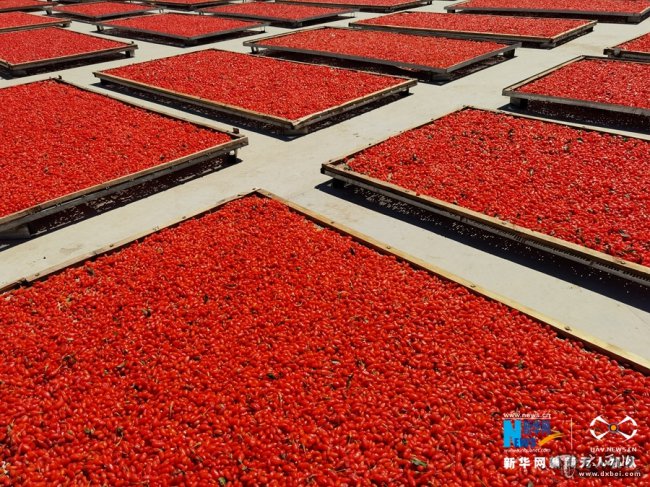 初秋时节,位于祁连山下的甘肃省张掖市甘州区种植的枸杞进入收获晾晒阶段,鲜红色的枸杞在阳光下更显艳丽。