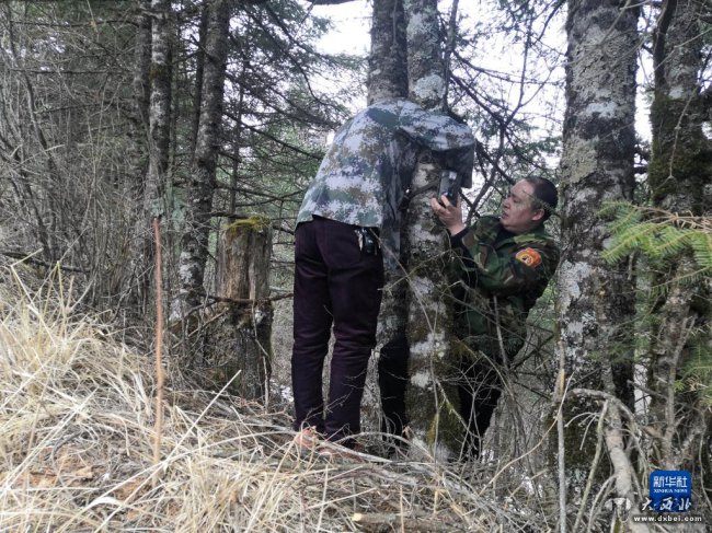 这是工作人员在平武县黄土梁区域安装红外相机(2020年2月25日摄)。