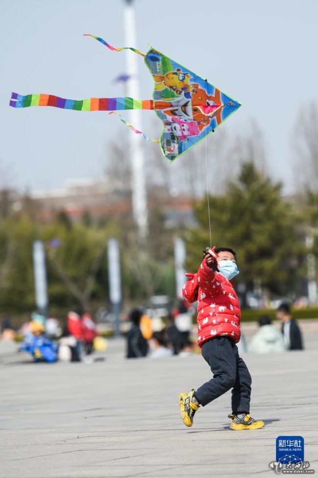 3月6日,一名小朋友在山东省青州市东夷文化标志园广场放风筝。