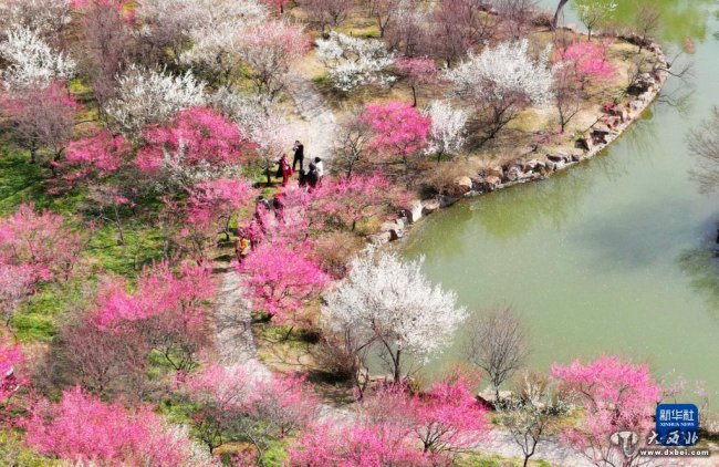3月6日,游客在江苏扬州瘦西湖风景区赏花游玩(无人机照片)。