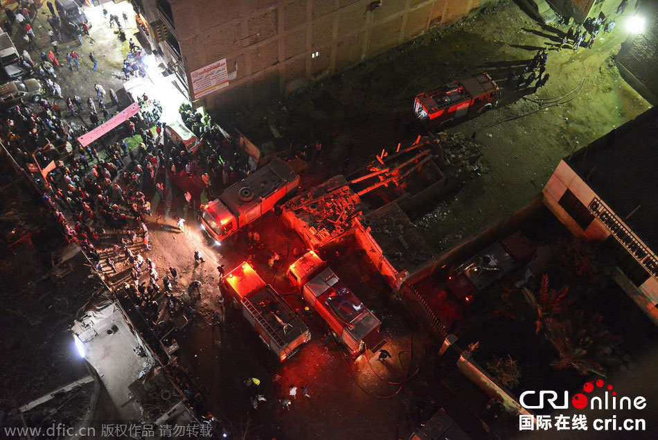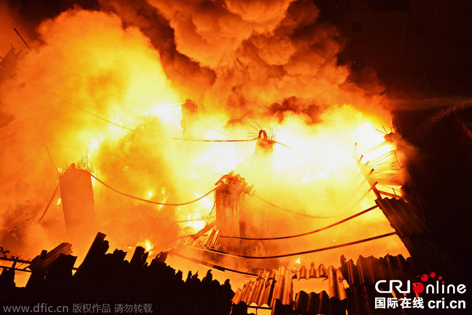 当地时间2015年2月3日,埃及开罗,当地一家香水厂由于备用电力系统发生电气系统故障引发大火,消防员赶到现场扑救。 图片来源:AMR SAYED APAIMAGES/东方IC