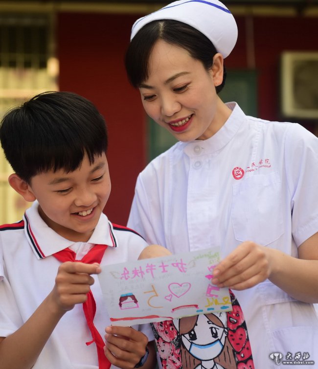 5月11日,河北省沧州市新华区车站小学学生为沧州市人民医院的护士阿姨送上美术作品,表达敬意。新华社发(傅新春 摄)