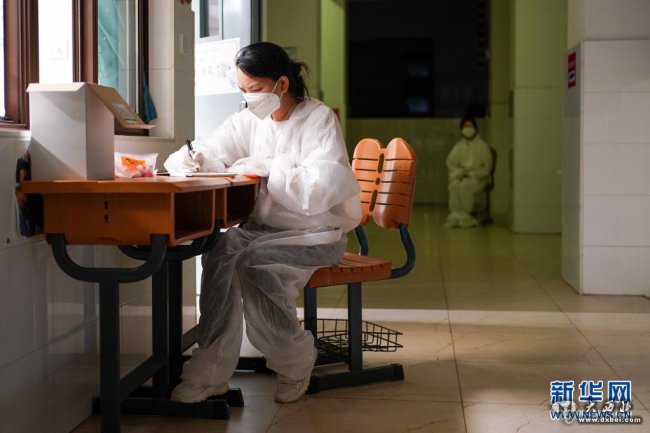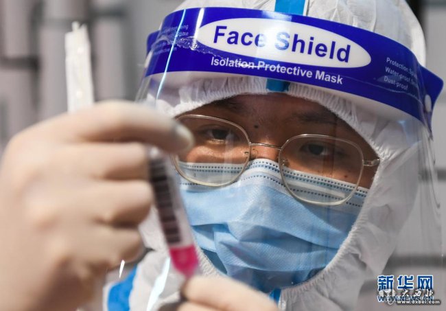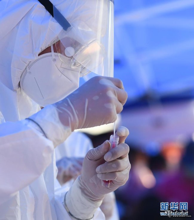 7月21日,在南京市江宁区万科·金域蓝湾小区核酸检测点,江苏省中西医结合医院医生张勇在忙碌。新华社记者 季春鹏 摄