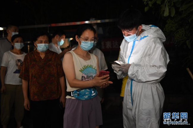 7月24日,在南京市江宁区秣陵街道高尔夫国际花园小区核酸检测点,社区网格员刘明辉(前右)在帮助居民登记信息。新华社记者 季春鹏 摄