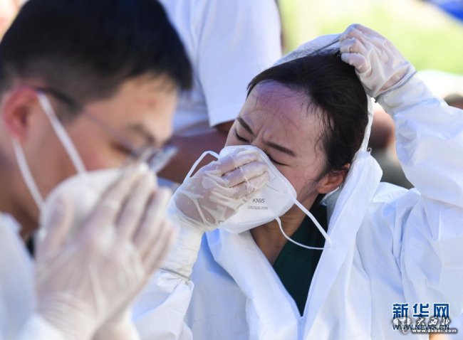 7月25日凌晨,在南京市江宁区秣陵街道高尔夫国际花园小区核酸检测点,南京同仁医院护士高敏(右)在工作结束后帮助百家湖社区卫生服务中心医生蔡杰脱下防护服。新华社记者 季春鹏 摄
