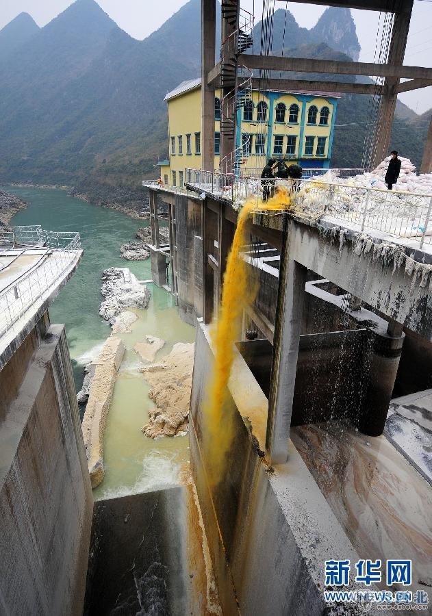 1月26日,在广西龙江河宜州洛东水电站大坝,处置人员在向河中投放石灰和氯化铝,中和过滤河内超标的镉,降低镉浓度。位于广西宜州市境内的龙江河发生镉浓度超标后,河池市第一时间启动应急预案