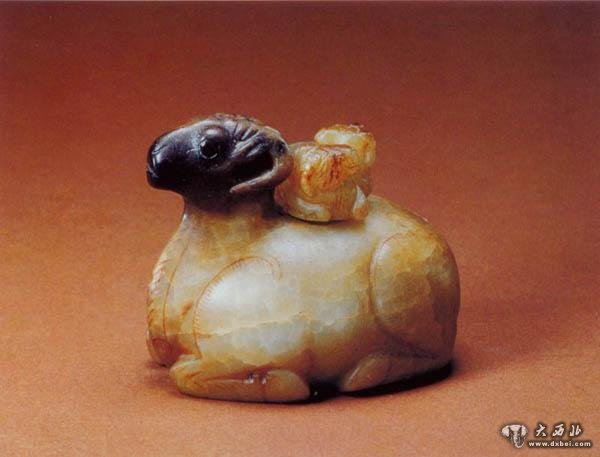 青玉,圆雕。羊首微举,双目平视。长角下垂,弯至胸前;双耳后展,贴于角旁。腹部着地,四腿曲卧。姿态稳健,神情安详,呈现出平和恬静的含蓄美。此羊玉质优良,青中透绿,黄斑亮丽。雕T刀法卓绝,打磨精细,不露琢痕。不仪形象逼真,而且洋溢着灵性,光彩动人。南北朝是佛教在中国迅速发展的时期,那时盛行以神龛佛像为主要题材的石刻泥塑,治玉业处于低符期。在这种历史背景下,出现工艺如此高超的玉雕作品,实在难得。