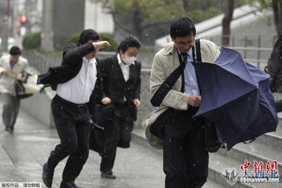 日本西部四国岛德岛市民众顶风冒雨走在大街上。