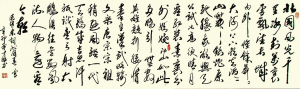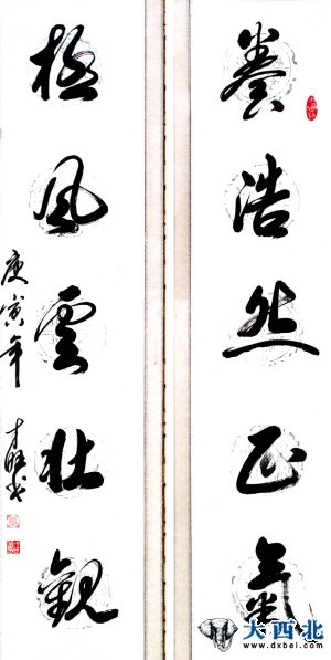 作品墨色灵活,变化自然,既有丰厚、凝重之浓笔;又有枯淡、疏轻之焦黑。浓郁与清秀相衬、厚重和潇洒互见。用笔雄浑,洒脱飘逸。手法自然,结字多彩,意境幽深,气存高远,造诣颇深。彰显了特有的视觉效果和对传统笔墨走势的灵动与才气。