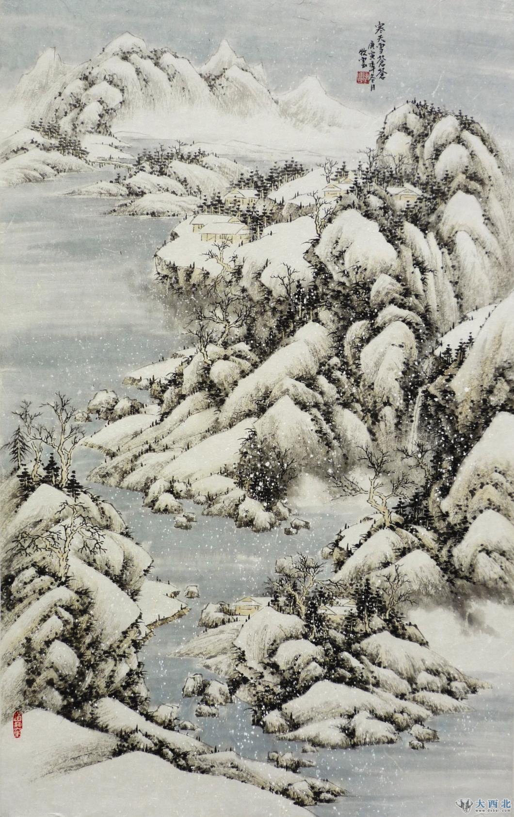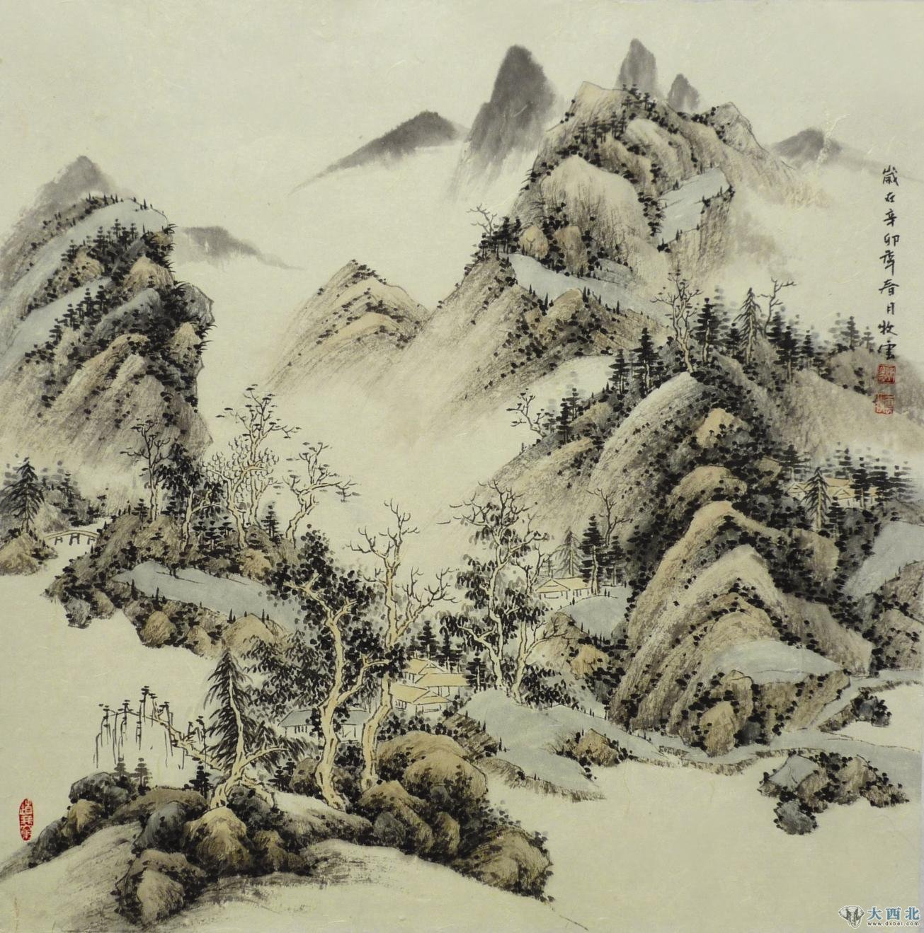 然永民兄并不满足于其时的画风和成绩,也不愿意在既有的面貌上驻足止步,而是于勤奋的创作中力求精进,使自己的山水语言更加纯粹。他曾对古人作品中出现的各种苔点进行了细致的深研,并与自己所感悟的自然之景相结合,创作出了一批富有个性的山水作品,作品中依旧是崇伟高峻的山、清澈无尘的溪水,而在传统的勾皴擦染之外,对于点的演绎尤为多样也尤为引人注目:小溪边润泽的点是茂密的草丛,山岩上苍老的点是杂生的荆棘,远山上淡淡的点是隐约的远树……笔法多样、色彩绚烂的各种点使得画面具有一种特殊的、富有装饰性的审美意味。
