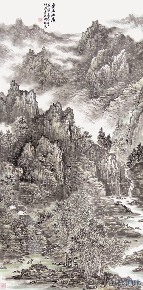 明代人张岱曾经说过:“人无癖不可交,以其无深情也。”何祖清的画作便彰显出浑然一片陇山陇水之癖,其笔墨深情就是对现实生活所表现的热情和态度,也是画家赖以创作、赖以大做文章、大显身手的契机。每个人的素养、兴趣、爱好乃至笔墨都是不同的,所以每个人对现实生活的感受和评价也各有差别,也正是如此,才能充分发挥每个人的个性。所谓师古人之心不如师古人之迹,何祖清画中写实的山水,究竟是何处的冈岭出没,林树隐显,大可不必寻根问底。“坐破苔衣第几重,梦中三十六芙蓉。倾来墨底堪持赠,恍惚难名第几峰。”这正是他乡情的纠结。