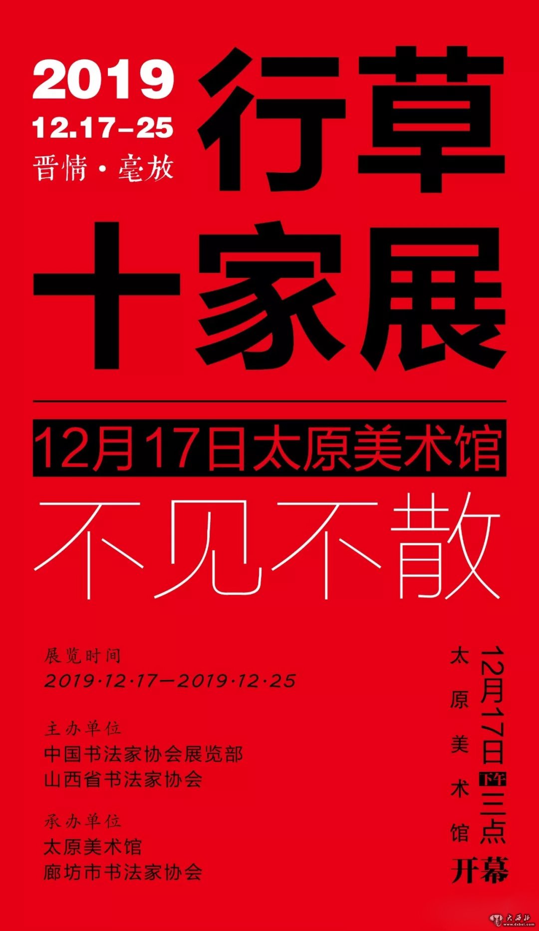 由中国书法家协会展览部、山西省书法家协会主办、太原美术馆、廊坊书法家协会承办的“晋情毫放·行草十家展”12月17日将在在太原美术馆开幕。届时,胡传海、王春新、王厚祥、洪厚甜、李远东、张纬东、刘京闻、王乃勇等著名书法家将携书法作品参加展出。