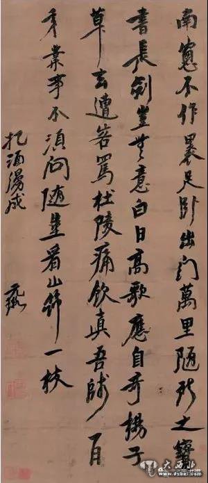 古人一向认为“颜书得篆意,苏书得隶意”,从两人书作中考察确实如此。而倪元璐凝涩激越的书风、雄浑苍劲的骨力得力于颜书之篆意,其横向开张的笔势运动以及方侧用笔之重,或自苏书的隶意而变化,或得自六朝碑版的影响。从其作品中可知,倪书用笔跌宕、翻裹斩钉截铁,且时或以屋漏痕意作书,线条苍健恣肆,可谓古朴浑厚,这一点恰与北碑相似。倪元璐《把酒漫成诗轴》等作品有北碑之气象,他有习魏碑之意:“堕唐宋习气数年来,始知学为汉魏。”