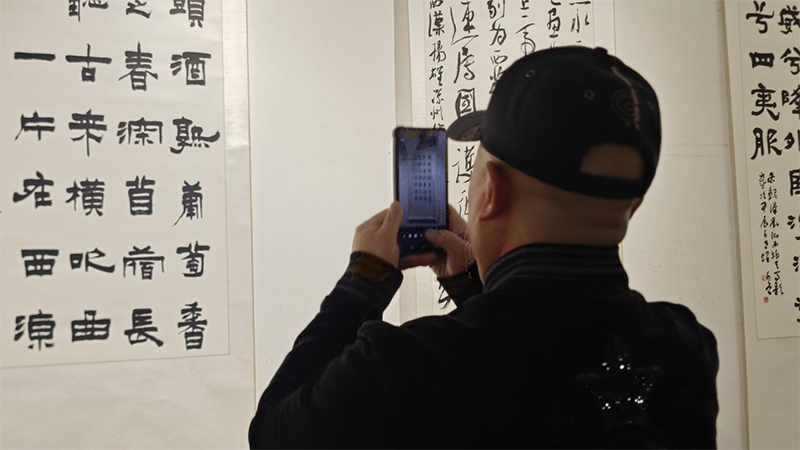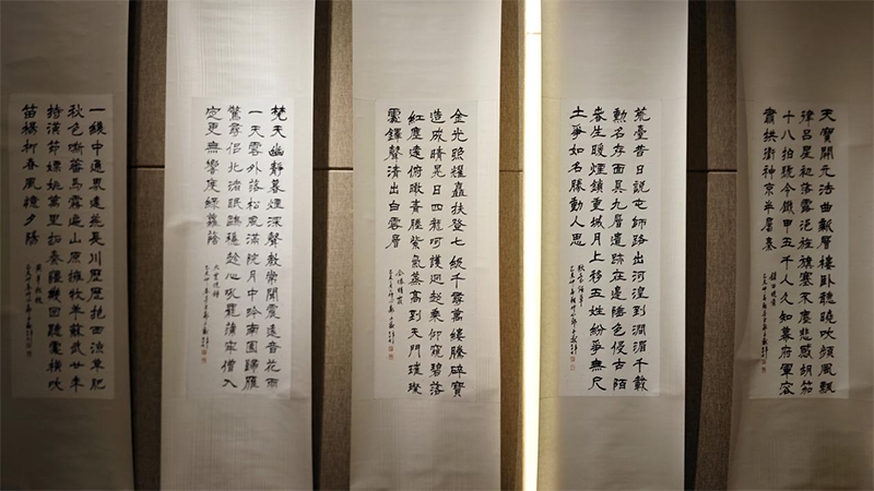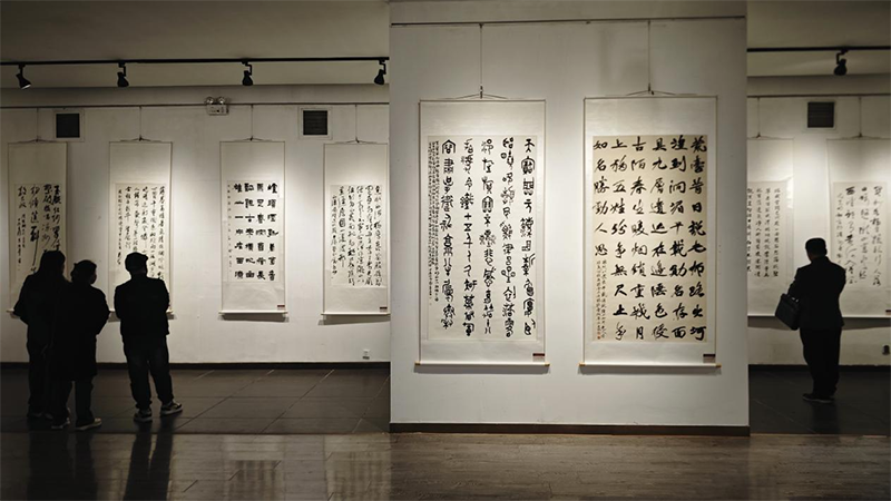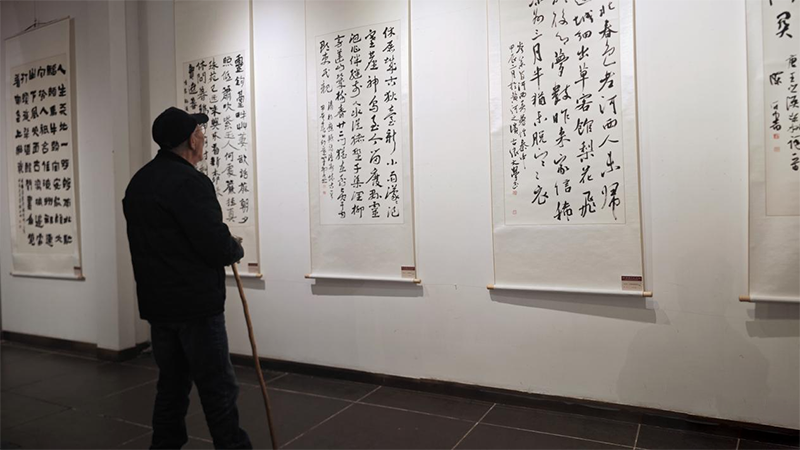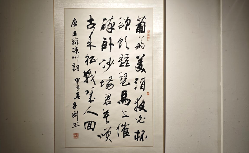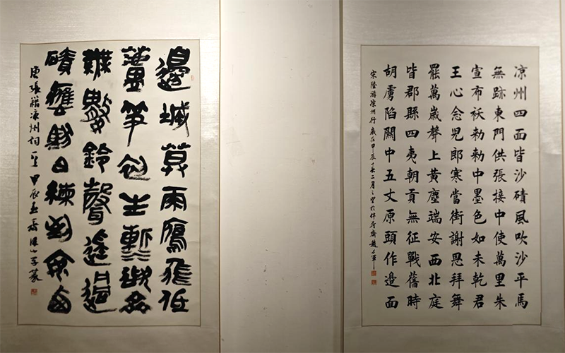11月12日上午,“只将诗思入凉州——百首凉州词书法作品展”在甘肃省艺术馆开展,展览至15日。书韵与诗情的联袂,书美与诗美的共衬,展示了“凉州词”的艺术魅力。本次展览由甘肃省文学艺术界联合会、甘肃省书法家协会、武威市文学艺术界联合会主办,武威市书法家协会、甘肃省艺术馆承办,兰州市武威商会协办。(童张伟 摄)